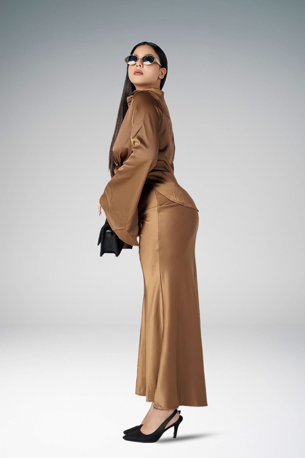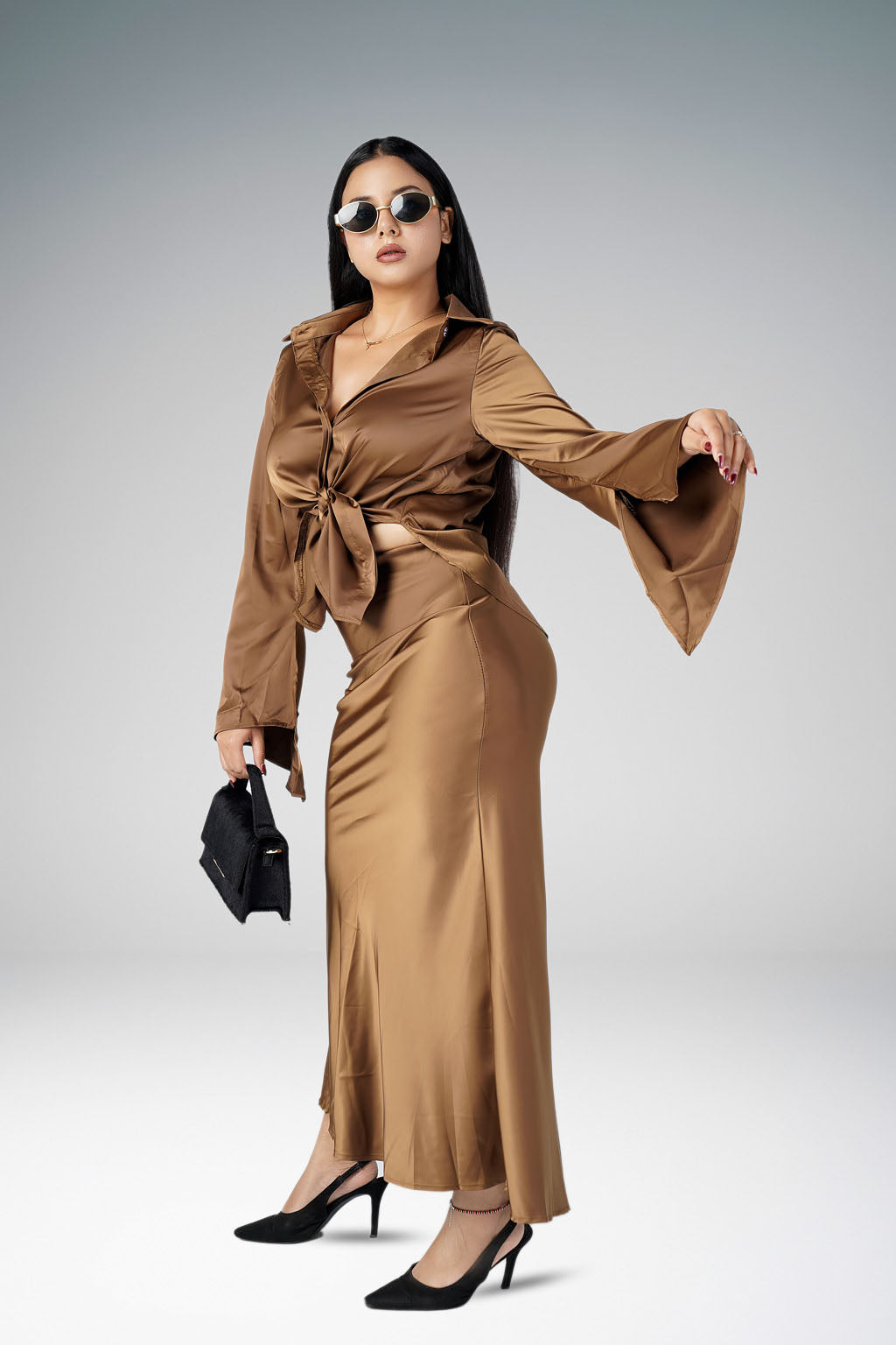Two Piece for Women Lapel Spliced Bandage Flare Sleeve Shirt High Waist Bodycon Maxi Skirt Sexy Suit Female