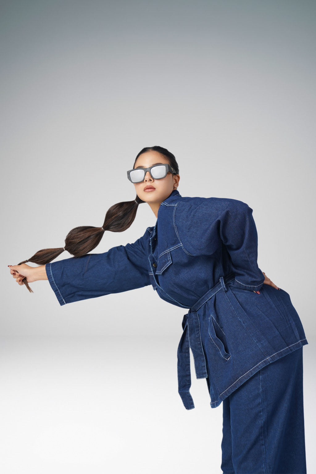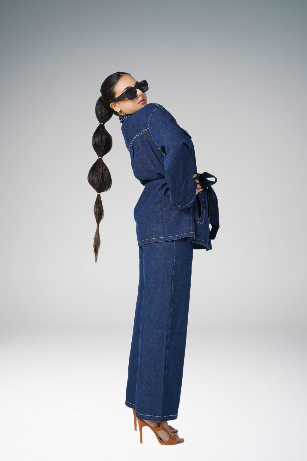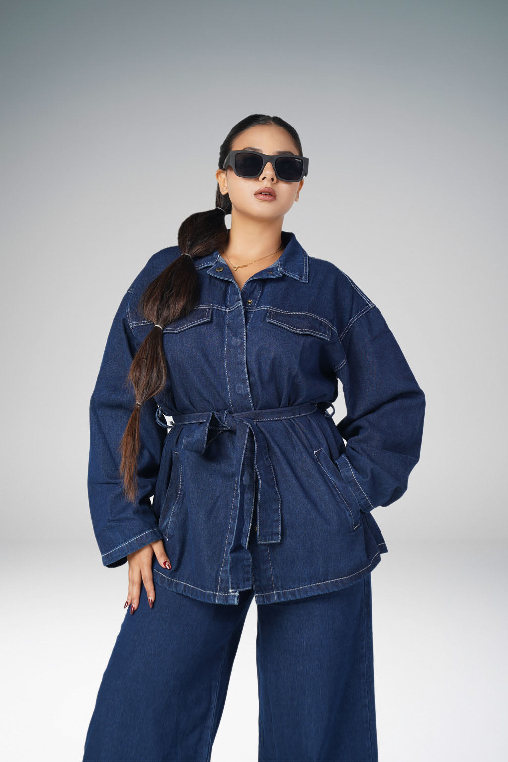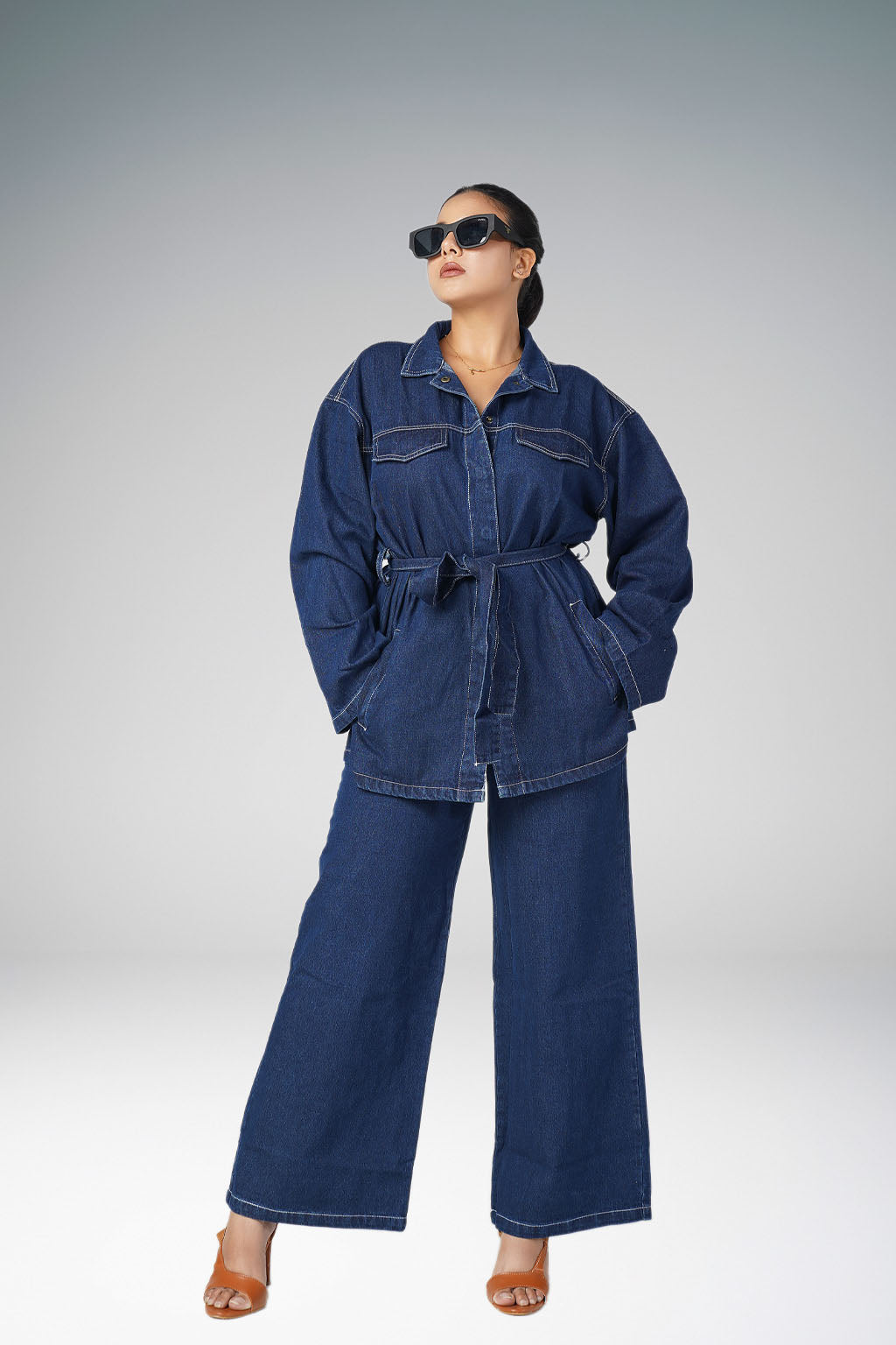 A Dark Denim Co-ord set with full length pants and a denim tie up shirt